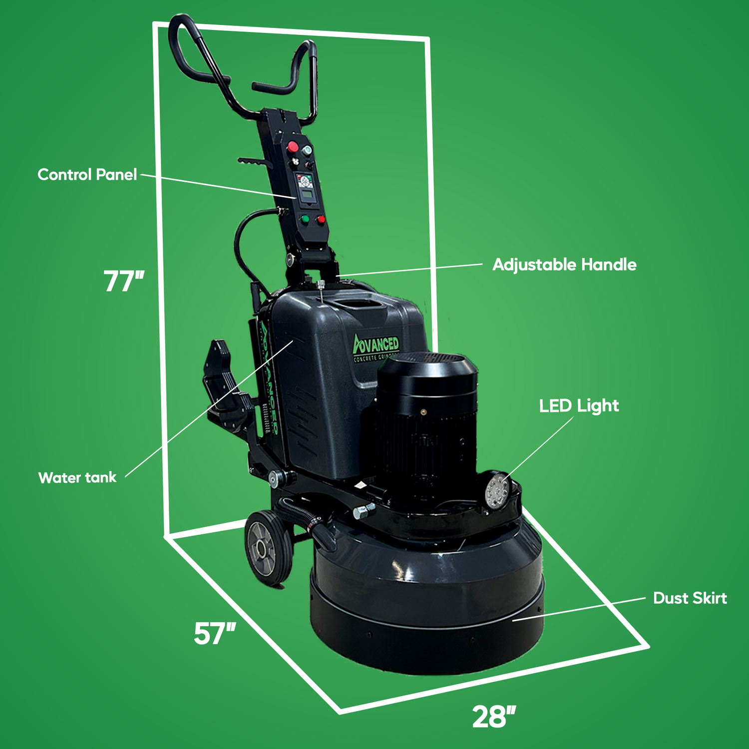 The Advanced Concrete 28 Inch grinder/Polisher is a great overall machine that offers a powerful grinding and polishing experience. This machine is planetary gear driven making it capable of reaching a remarkably flat grind to produce smooth surfaces. Because the machine is gear driven, there is no need for belt changes.
