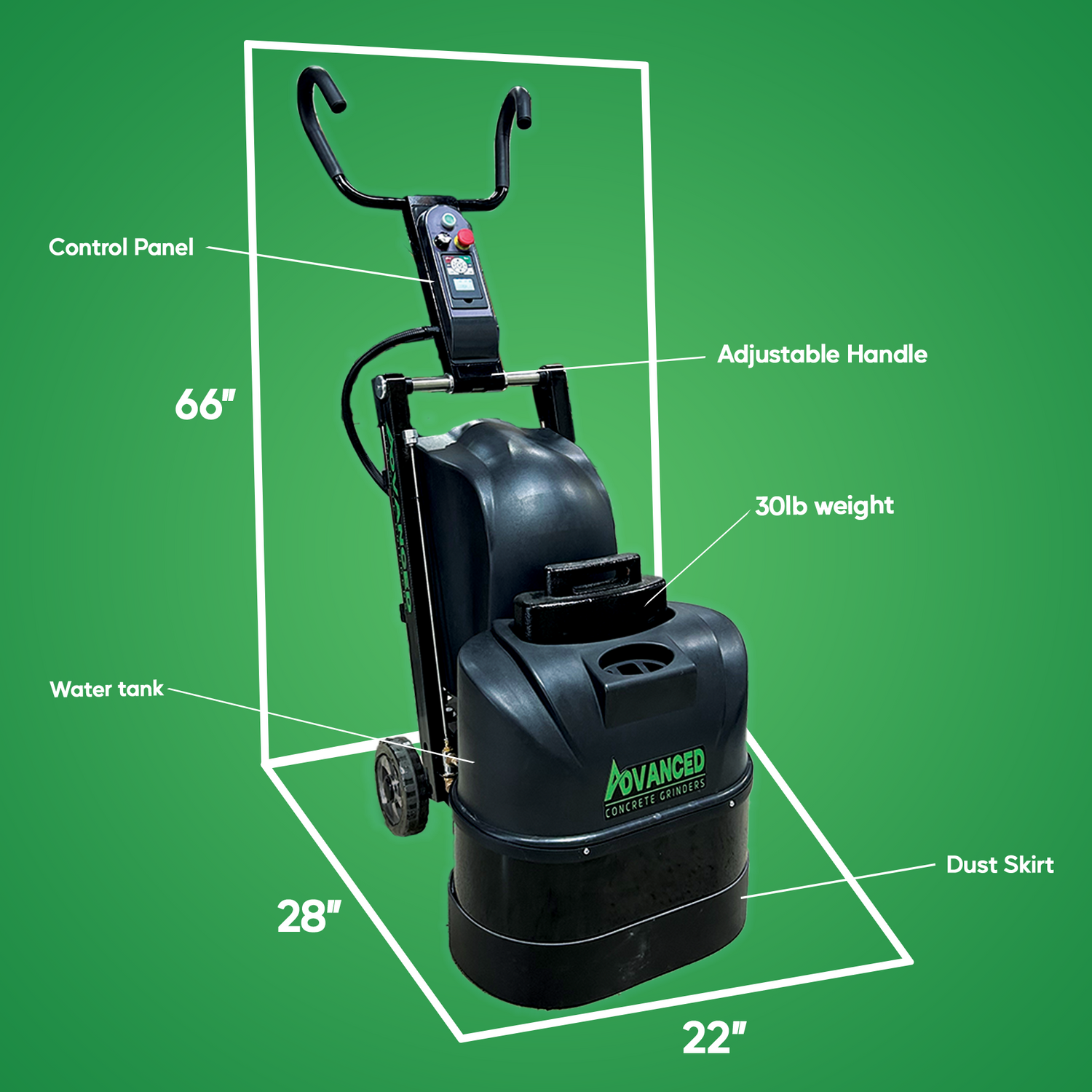 The new Advanced Concrete 22 Inch Grinder/Polisher is designed to grind and polish various concrete floors as well as stone and tile. Suitable for grinding and polishing small to medium sized floors. It is lightweight, flexible and easy to operate, with a tapered shroud perfect for close grinding up against walls.